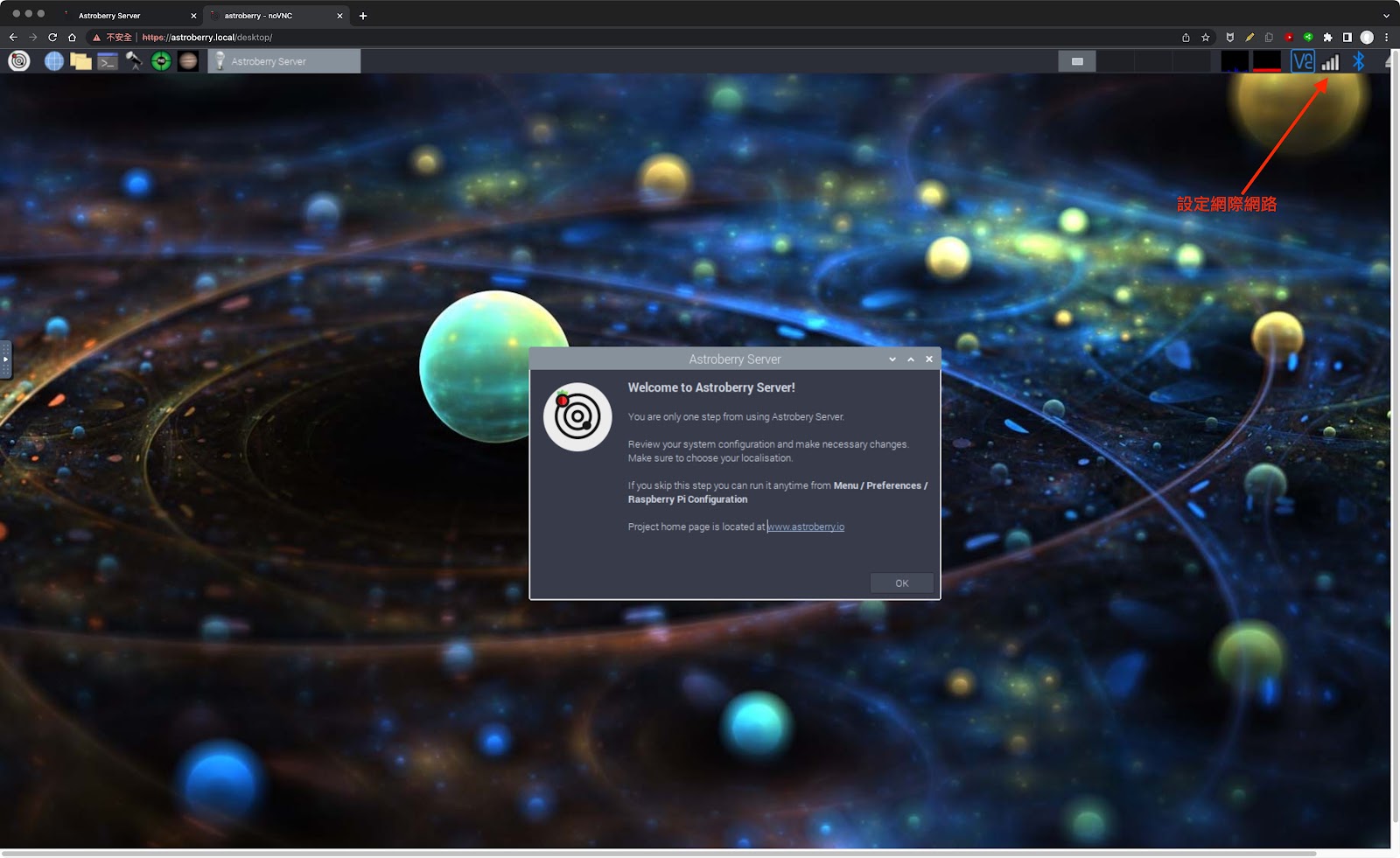 - 點選 OK 並輸入密碼「astroberry」後開始設定系統: