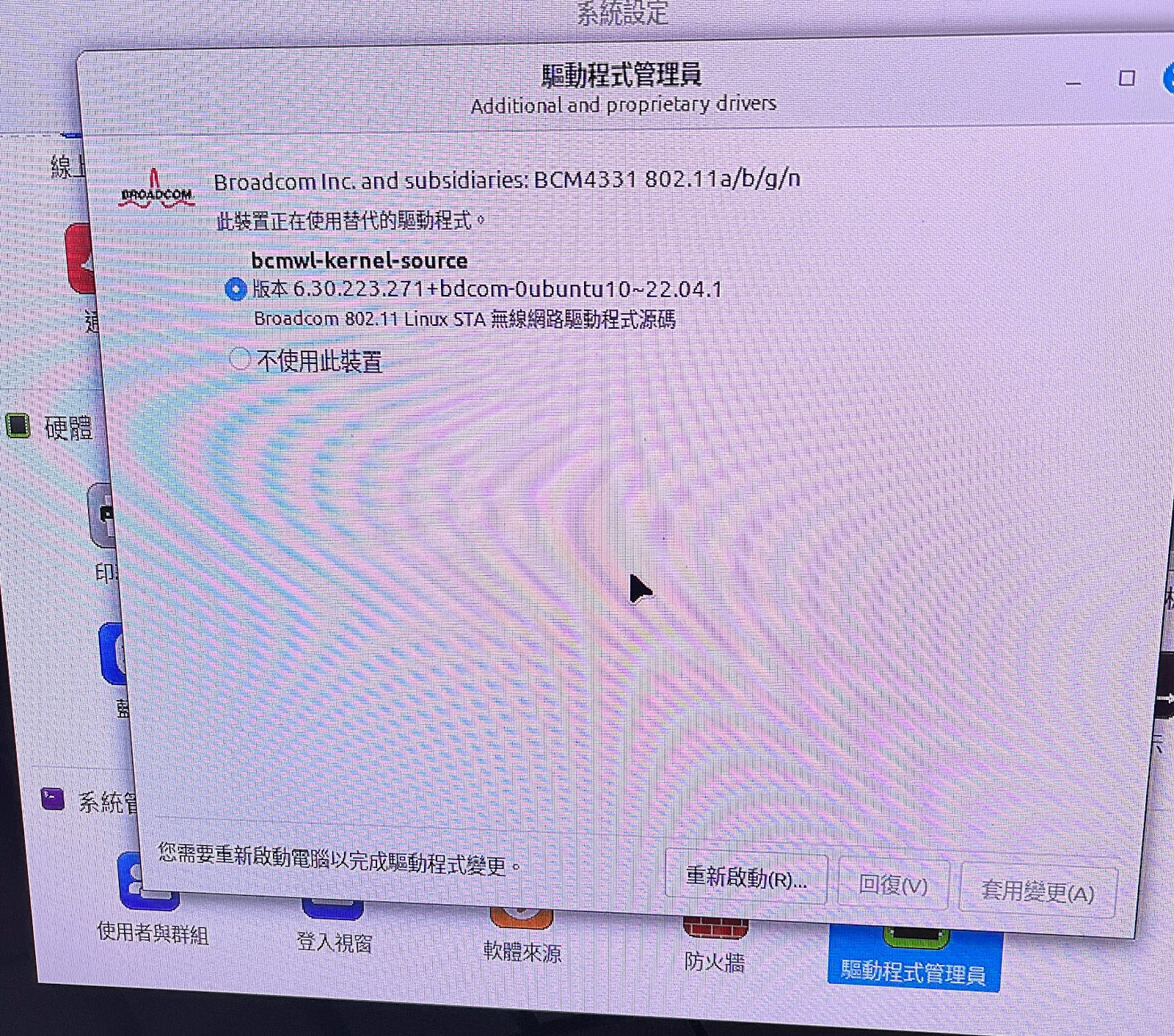 重新開機後,一切正常,但就是沒有 Wi-Fi,從 System Settings ->Driver Manager 得要再插入 Mint 安裝影像檔的隨身碟才能找到 bmwl-kernel-source: